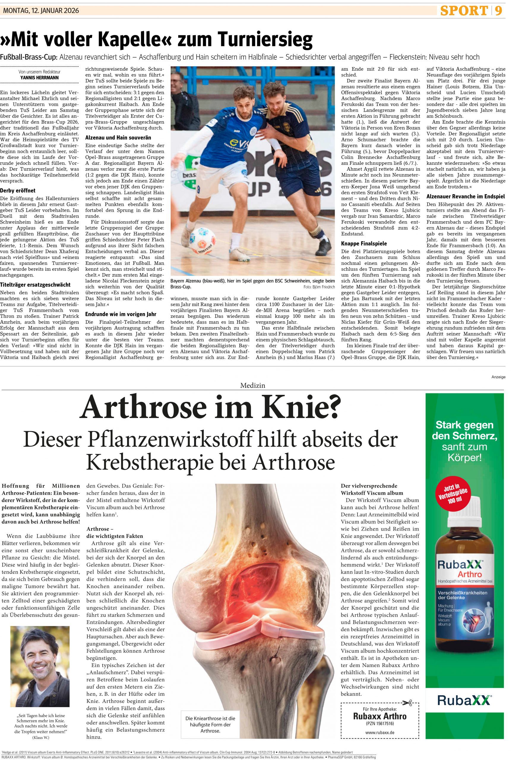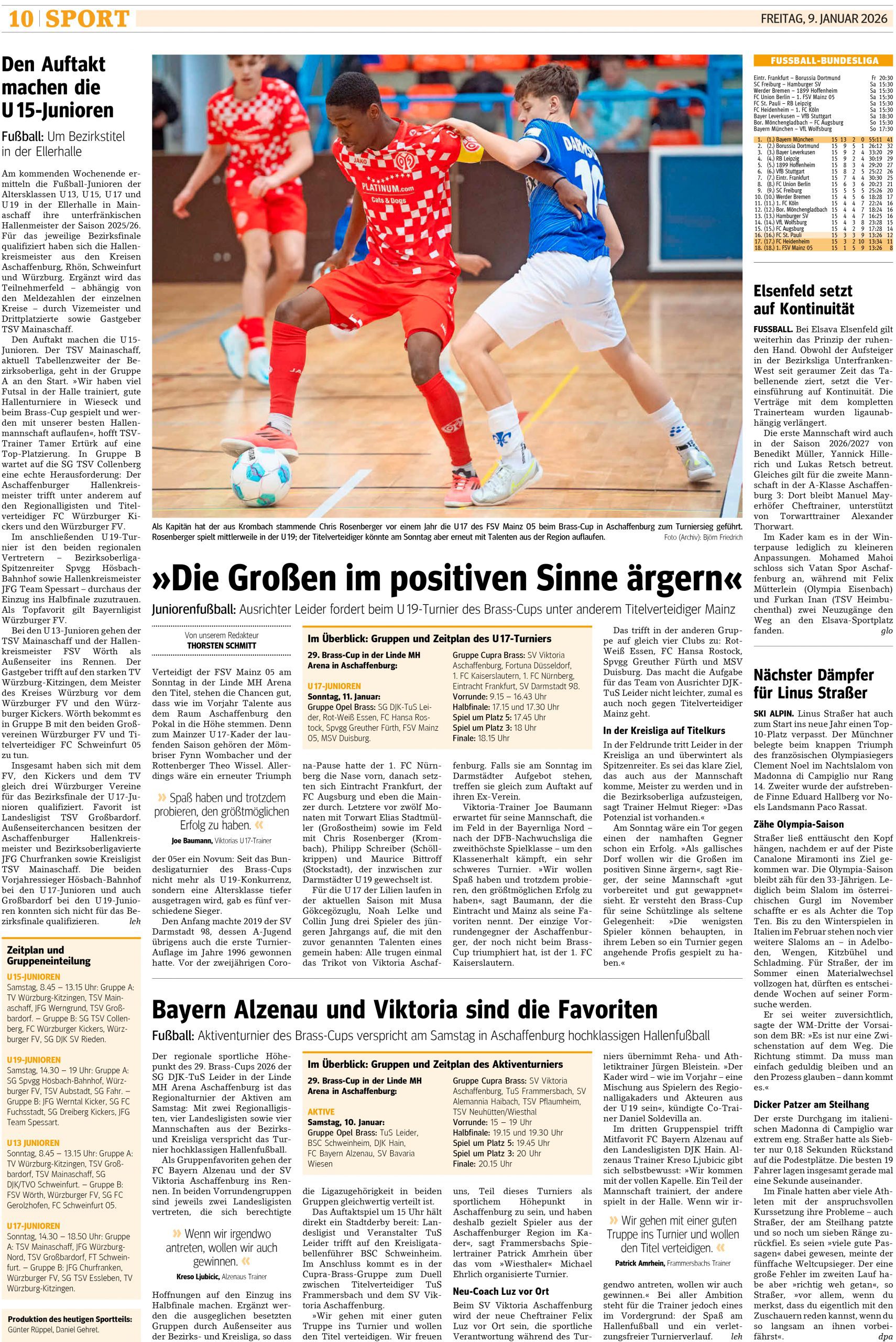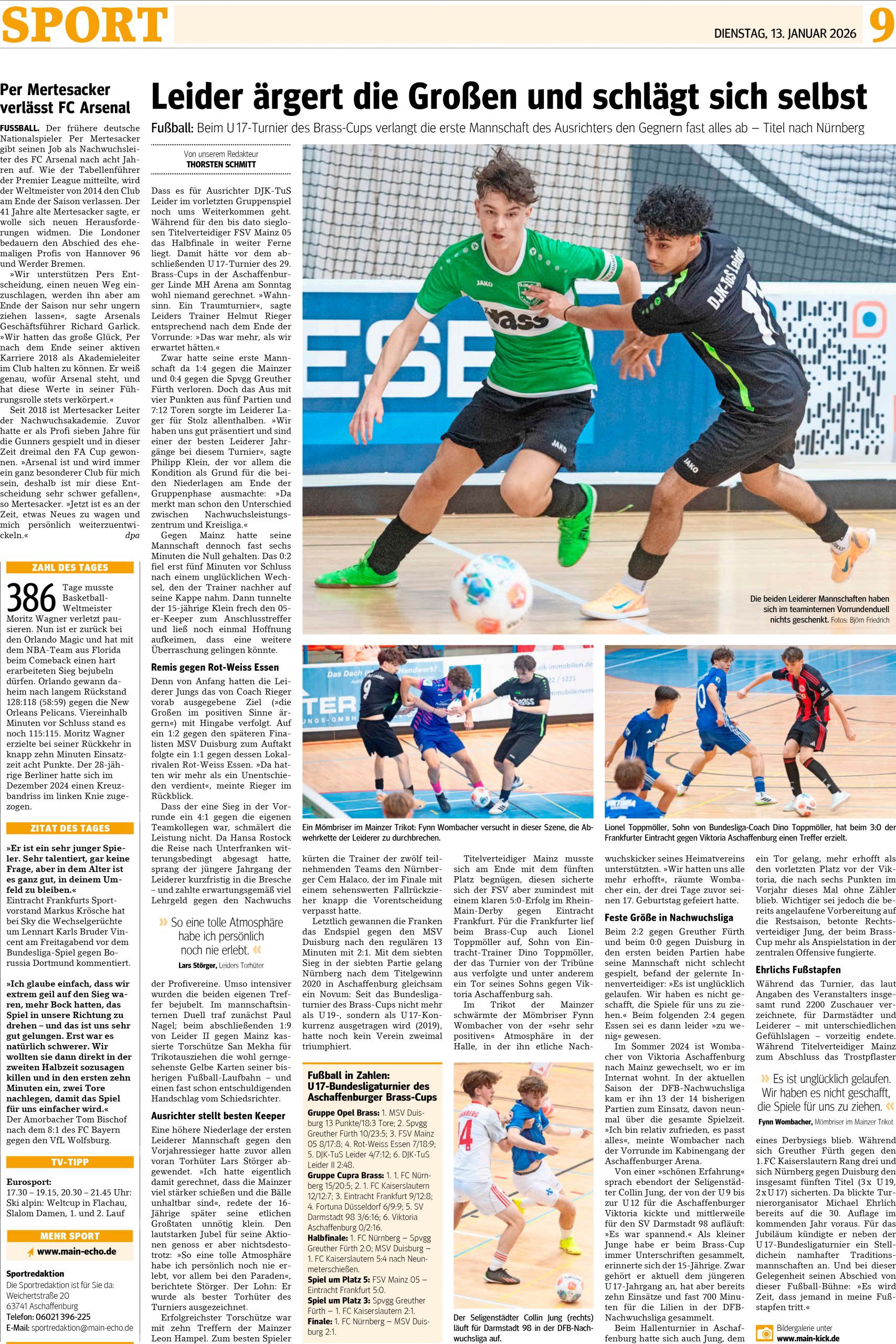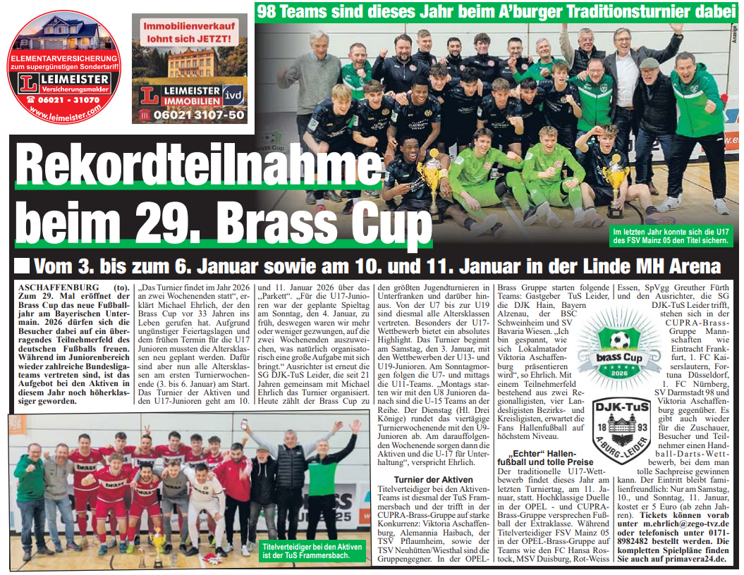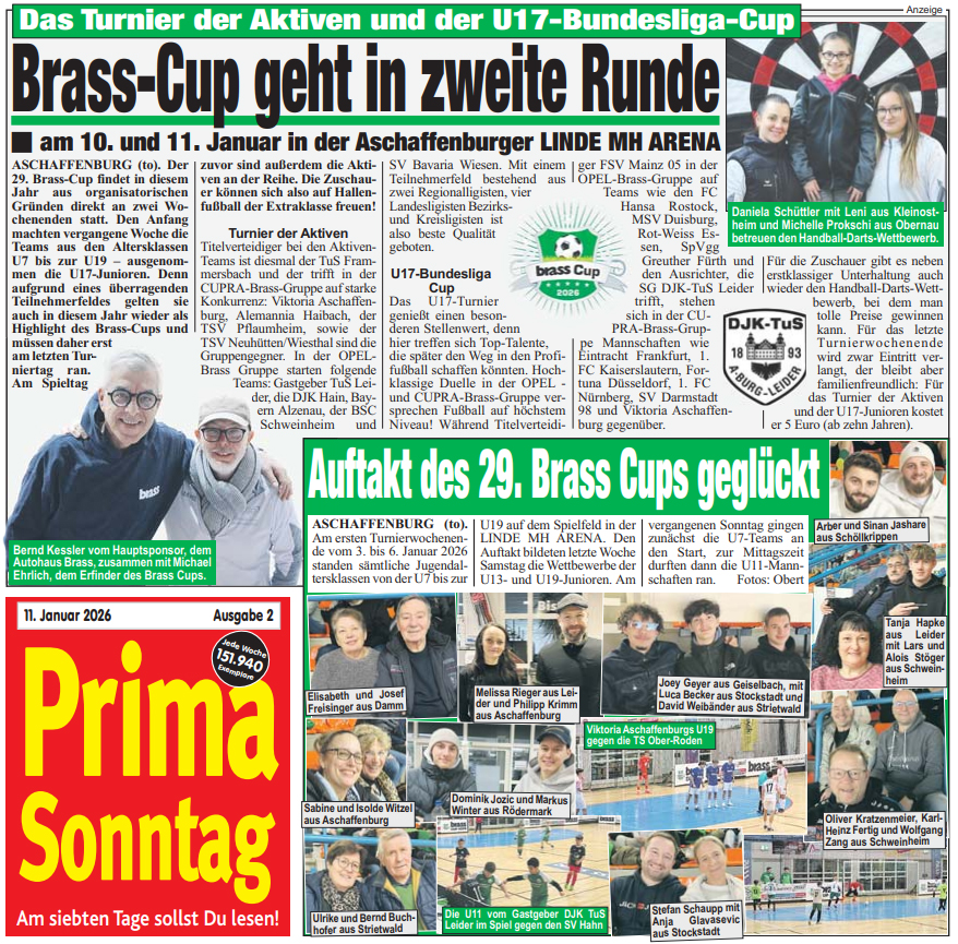 Der Brass-Cup 2026 in Aschaffenburg sorgte für spannende Momente und mitreißende Spiele. Wir bieten Euch hier nochmals Einblicke in den packenden Wettbewerb, präsentieren exklusive Berichte aus der regionalen Presse und teilen faszinierende Impressionen sowie Bilder von den Teams und den Fans.